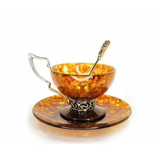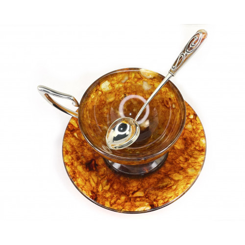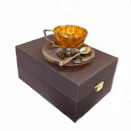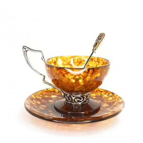 Высота: 5,5 см, диаметр: 8,0 см, диаметр блюдца: 12,0 см, длина ложки 11,0 см, объем - 90 мл. Состав: натуральный янтарь,белая ювелирная бронза/серебро 875 пробы. В набор входит чашка, блюдце и ложка. Набор располагается в элегантном футляре. Может поставляться наборами на 1, на 2, на 3 и на 6 персон. Рекомендуемая температура для горячего чая не более 80 градусов.