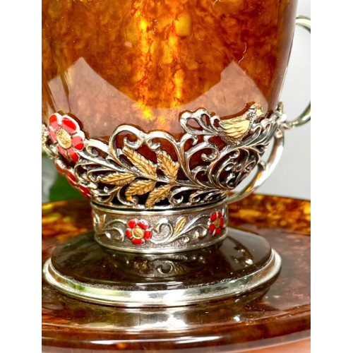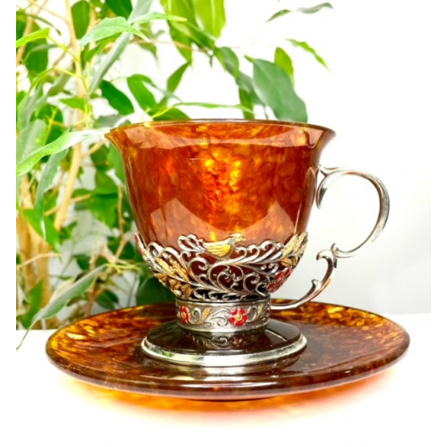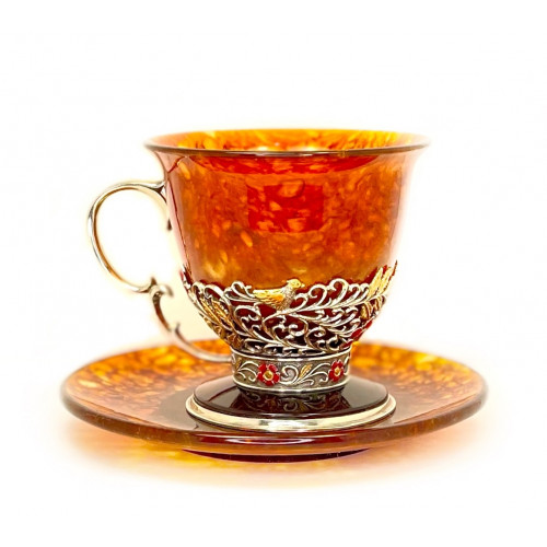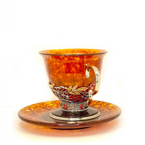 Изысканная чайная чашка с декором, изготовленном в стилистике хохломской росписи. Состав: янтарь, белая ювелирная бронза, эмаль, позолота. Объем чашки 180 мл., диаметр блюдца 15 см. Поставляется в подарочном футляре. Оттенок янтаря может варьироваться от более светлых до более темных тонов. В случае отсутствия на складе срок изготовления может составлять от одной до трех недель.