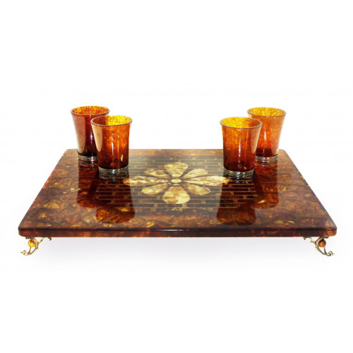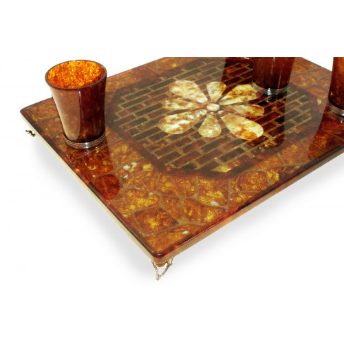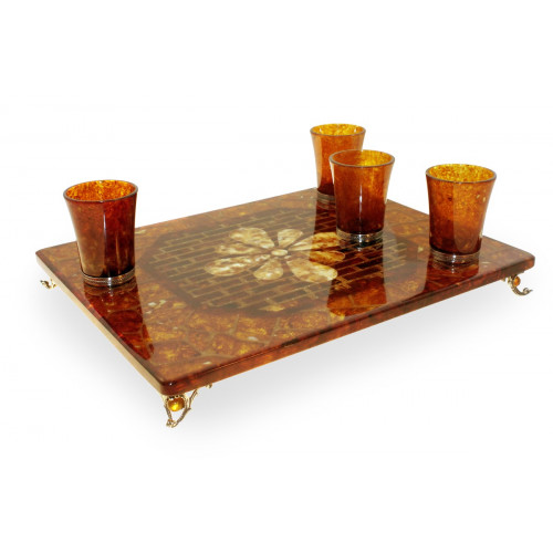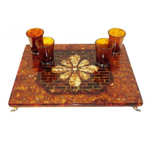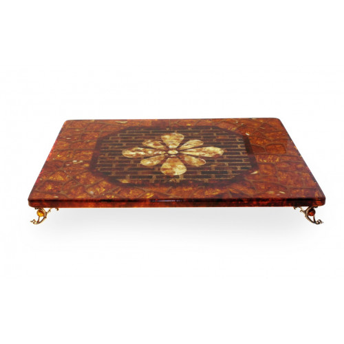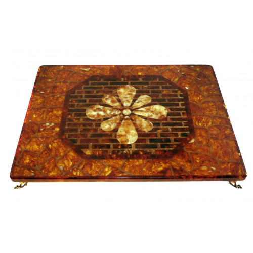 Основа столика - бук, облицованный янтарем. Ножки столика - бронза. Размеры: 31х23х3,5 см. Оттенок янтаря может отличаться от оттенка на фотографии. Поставляется в подарочном футляре. В случае товара на складе срок изготовления 3-4 недели.