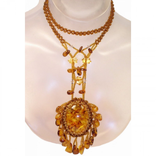 Длинный эффектный кулон из балтийского янтаря и бисера 30005
