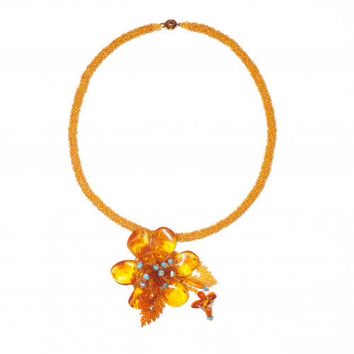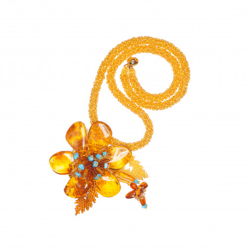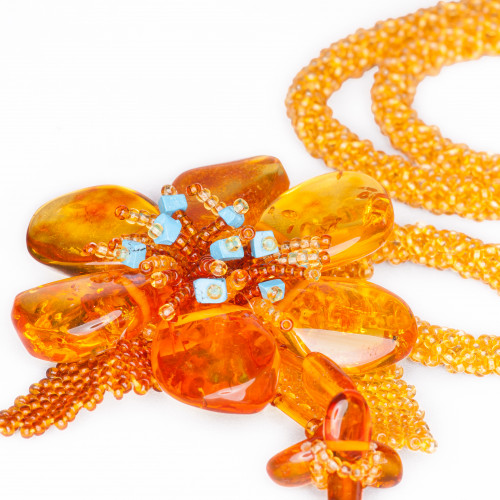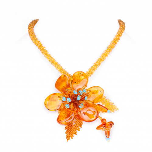Колье в виде цветка из балтийского янтаря, бисера и бирюзы 10270-3n