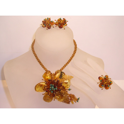 • Комплект из природного янтаря, бисера и малахита: колье, кольцо, клипсы 10270c,10270n,10270r