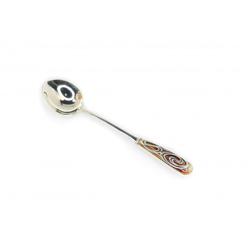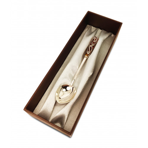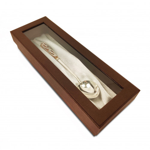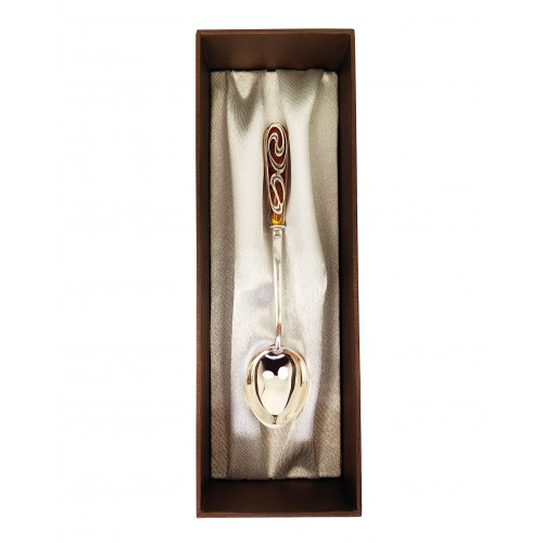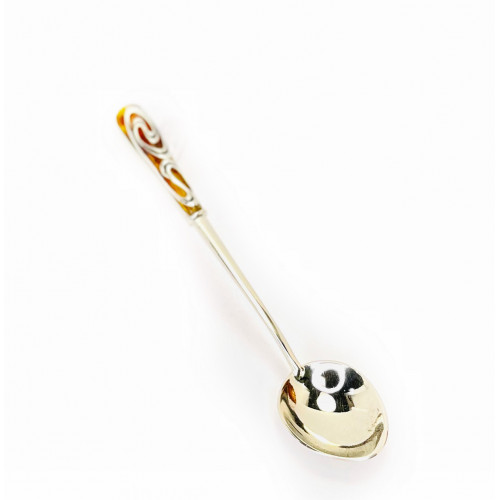 Элегантная ложечка из серебра 875 пробы и янтаря. Длина ложки 11 см, вес серебра 12,9 гр. Поставляется в коробочке цвета горького шоколада с прозрачным окошком, ложемент из серого шелка.