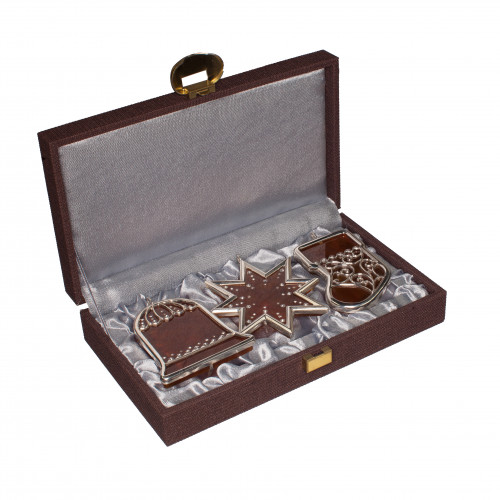 Набор елочных украшений, состоящий из трех предметов: колокольчика, звездочки и носочка.Оригинальный и необычный сувенир из натурального янтаря и белой ювелирной бронзы,украшенный сверкающими кристаллами Сваровски. Оттенок янтаря может варьироваться.
