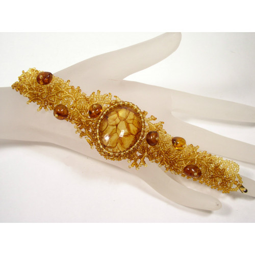 Плетеный браслет из бисера и натурального светлого янтаря 20030