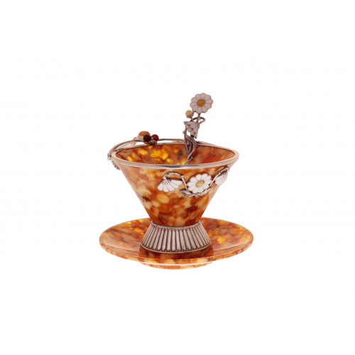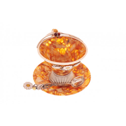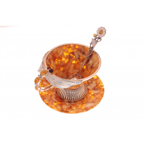 Чашечка, блюдечко, ложечка. Состав: янтарь,белая ювелирная бронза, эмаль, кристаллы Сваровски. Объем чашечки 100 мл. Размеры: диаметр чашки - 9 см., высота чашки - 8 см., длина ложечки - 12 см. Поставляется в фирменном подарочном футляре. Оттенок янтаря может отличаться от оттенка на фотографии.Образец футляра можно посмотреть в разделе "Футляры".