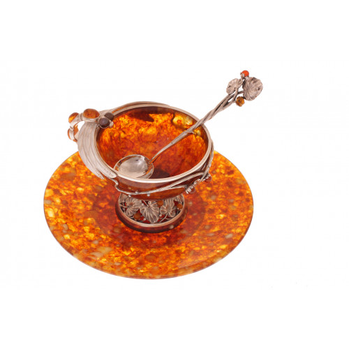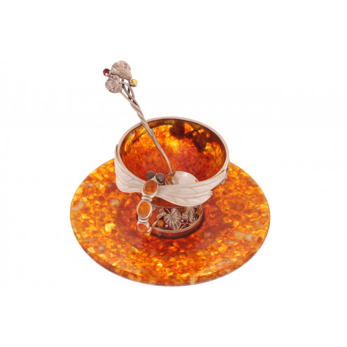 Чайный набор на 1 персону: чашечка, блюдечко, ложечка (серебряная), подарочный футляр. Состав: янтарь, серебро 875 пробы , речной культивированный жемчуг, кристаллы Сваровски, ювелирная эмаль. Высота чашечки 8,00 см. Объем 90 мл. Поставляется в подарочном футляре. Оттенок янтаря может отличаться от оттенка на фотографии.