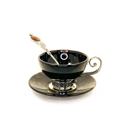 Высота чашки 5,5 см; диаметр емкости: 8 см; диаметр блюдца: 11 см; длина ложечки: 12 см. Объем 90 мл. Состав: натуральный черный янтарь (глауконит), серебро 875 пробы. Вес серебра в изделии - 52 гр. В набор входит чашка, блюдце, ложечка. Набор в элегантном футляре. Может поставляться наборами на 1, на 2, на 3 и на 6 персон. Рекомендуемая температура для горячих напитков (чай, кофе) не более 80 градусов. В случае отсутствия товара на складе срок изготовления варьируется от одного дня до трех недель.