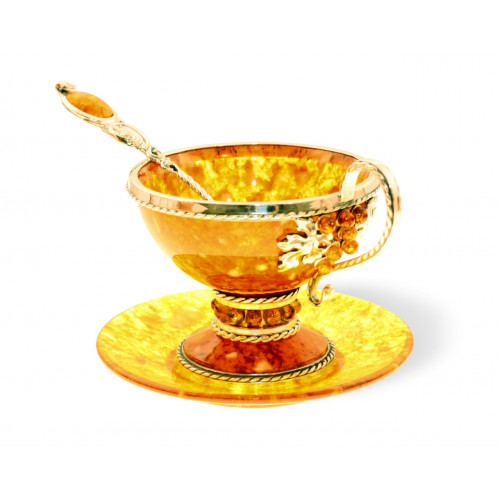 Высота: 7,0 см; диаметр чашки: 8,5 см; диаметр блюдца: 11,0 см; длина ложечки: 12,0 см. Объем: 100 мл. Состав: натуральный янтарь, серебро 875 пробы . В набор входит чашка, блюдце, ложечка. Набор в элегантном футляре. Может поставляться наборами на 1, на 2, на 3 и на 6 персон. Мы рекомендуем пить чай из этой чашки температурой не более 80 гр. Оттенок янтаря может отличаться от оттенка, представленного на фотографии.