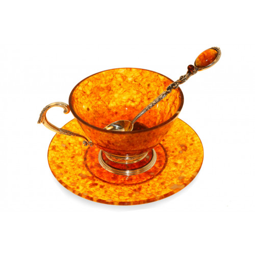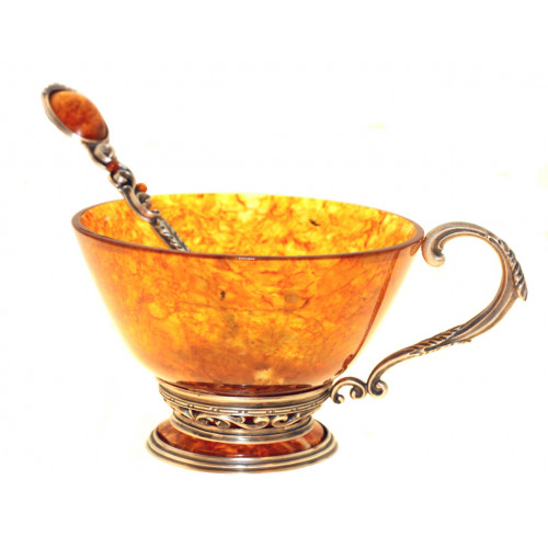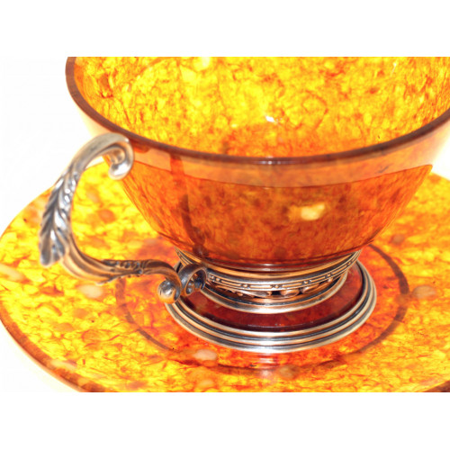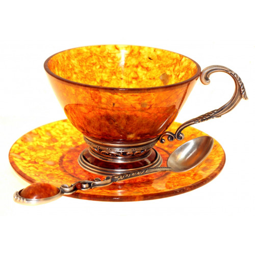 Состав: серебро 875 пробы , янтарь. Диаметр блюдца - 14-15 см., диаметр чашки - 10 см., высота - 7 см. Объем - 180 мл. Поставляется в подарочном футляре. Оттенок янтаря может отличаться от оттенка на фотографии.