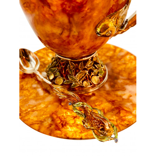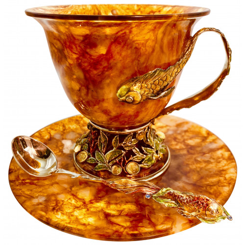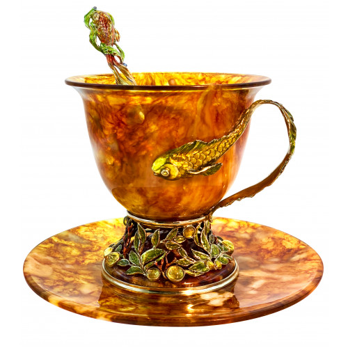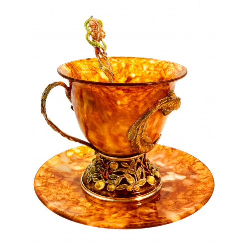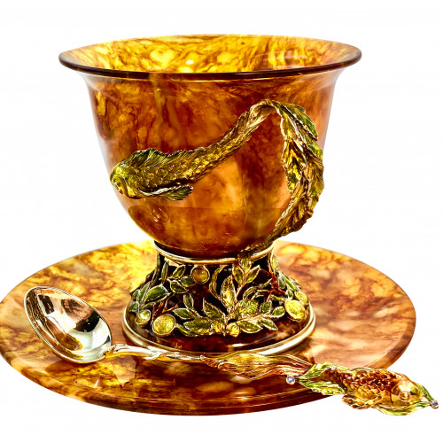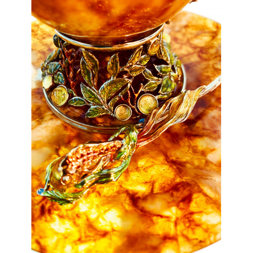 Чашка из янтаря и белой ювелирной бронзы, декорированная эмалью.