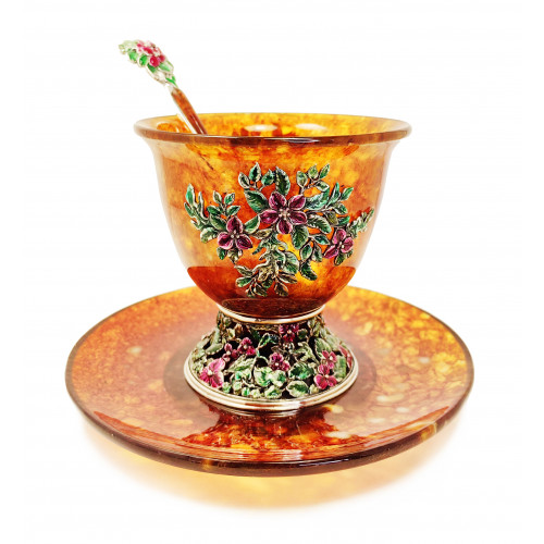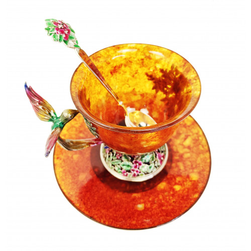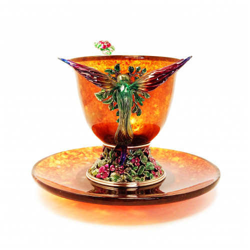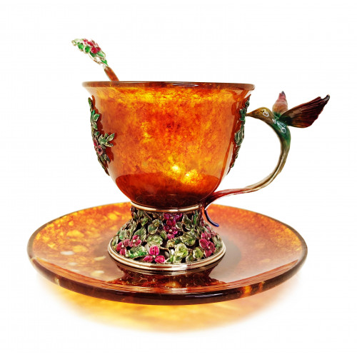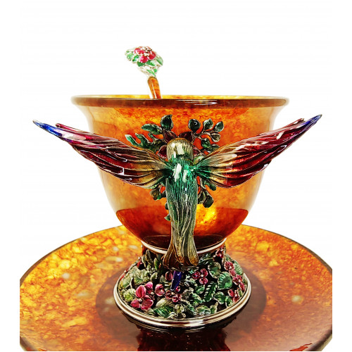 Чашка из янтаря и серебра 875 пробы , декорированная эмалью. Фоновый рисунок выполнен в виде зарослей цветов. Ручка представляет собой яркую, как драгоценный камень, роскошную птицу Колибри (эмаль).
