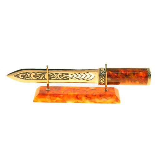 Нож для резки бумаги на подставке. Состав: янтарь, серебро 875 пробы . Оттенок янтаря может отличаться от оттенка на фотографии.  Размеры ножа: длина - 13 см, ширина - 2 см. По желанию заказчика может быть сделан в белой ювелирной бронзе. Поставляется в подарочном футляре. При отcутсутствии товара на складе, срок изготовления от 3-х недель.