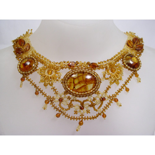 Роскошное плетеное колье из натурального янтаря и бисера 10306