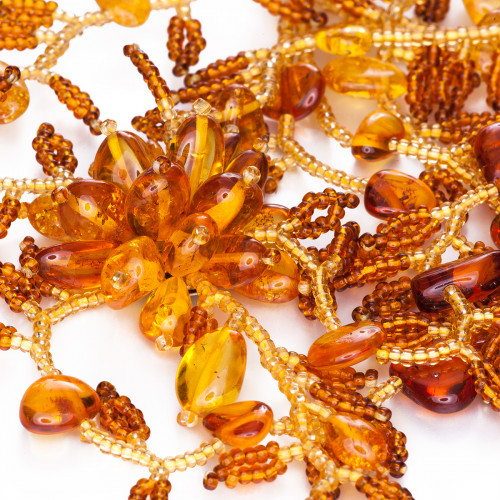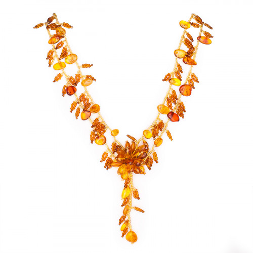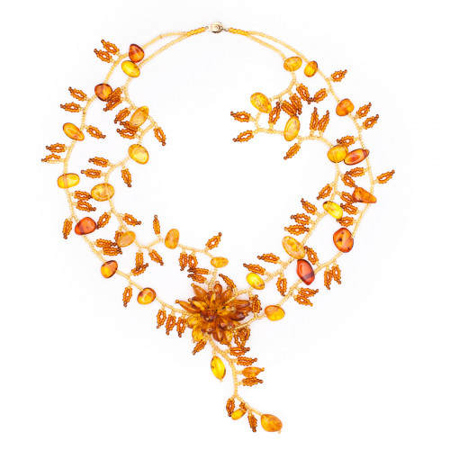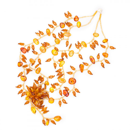 Удлиненное колье с цветком из натурального янтаря и бисера 10791