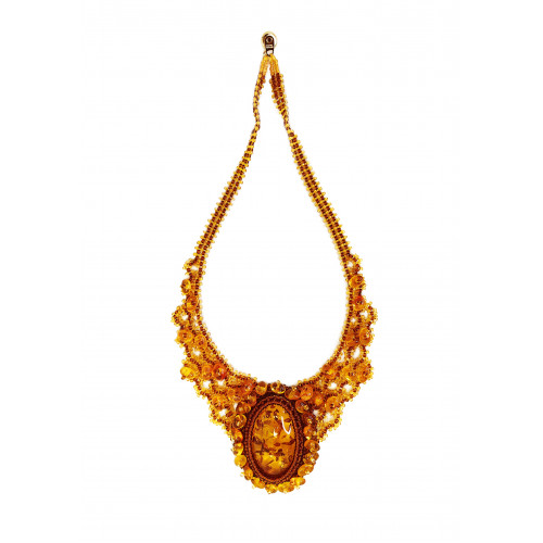 Бисерное плетеное колье с крупной вставкой из натурального янтаря 11113-2