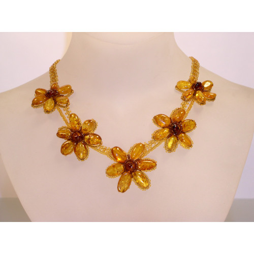 Колье из натурального балтийского янтаря и бисера с цветами 10233