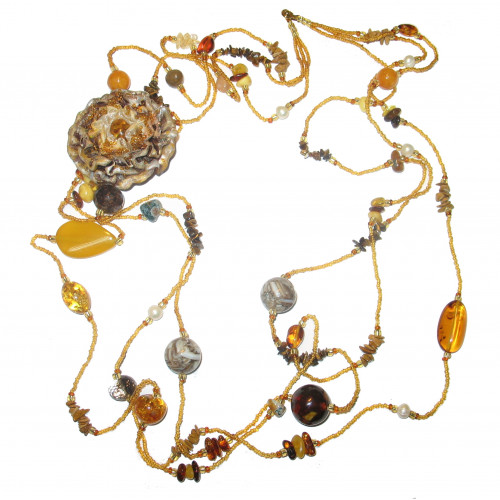 Колье из натурального янтаря бисера самоцветов и органзы 10910-3