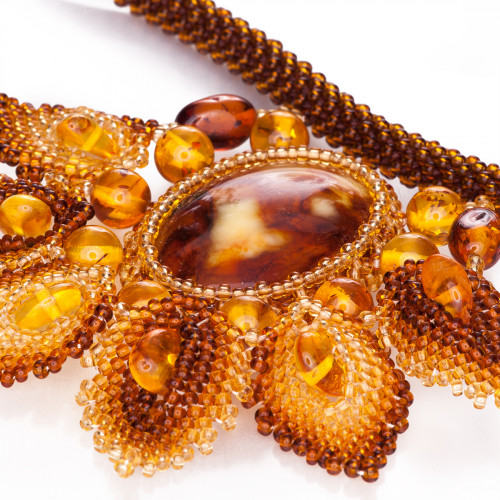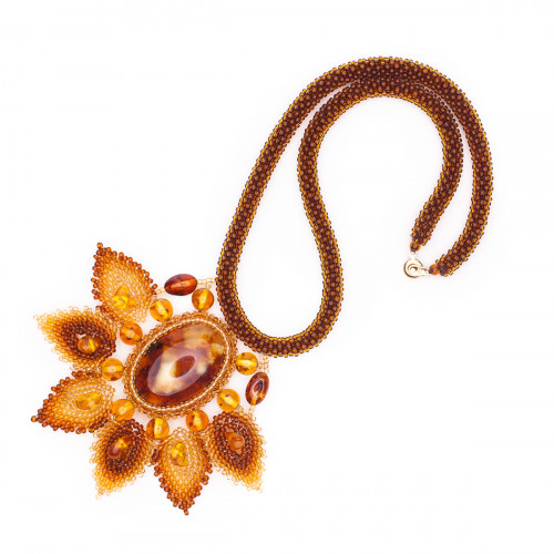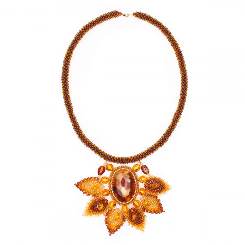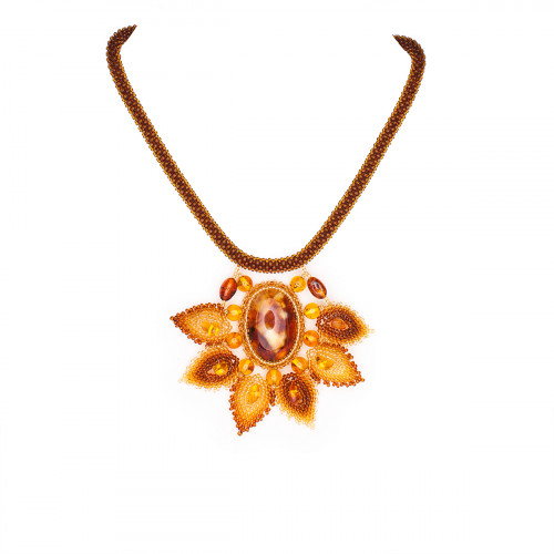 Колье с цветком из янтаря коньячного цвета с бисером 11031-3