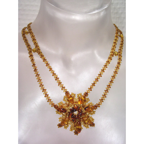 Красивое колье из натурального янтаря и бисера с цветами 10292