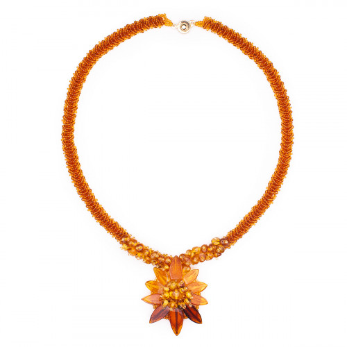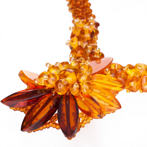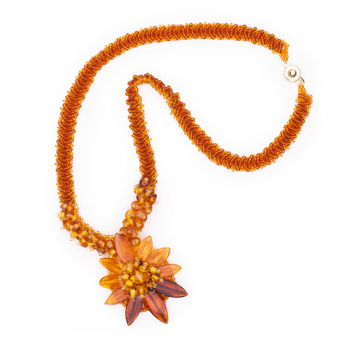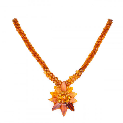 Красивое колье из натурального янтаря и бисера с цветком 10201