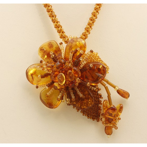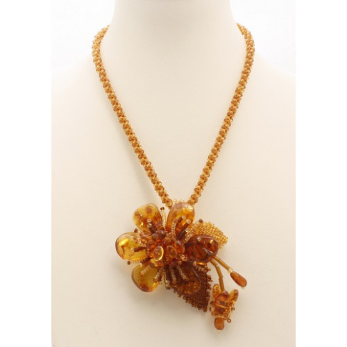 Красивое колье из натурального янтаря и бисера с цветком 10270-2n