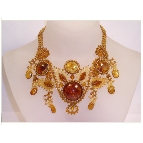 Красивое плетеное колье из натурального янтаря и бисера 10325