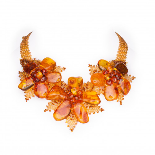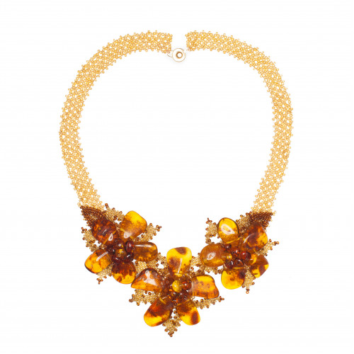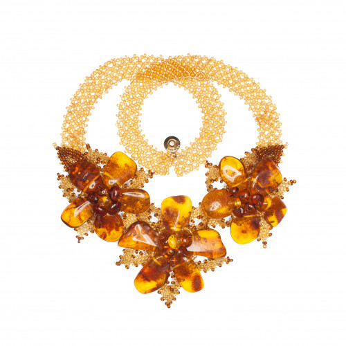 Красивое плетеное колье из натурального янтаря с цветами 10933