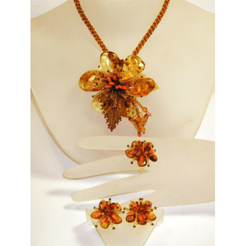 • Красивый комплект из натурального янтаря, бисера и коралла: колье, кольцо, клипсы 10270-1n,10270-1r,10270-1c