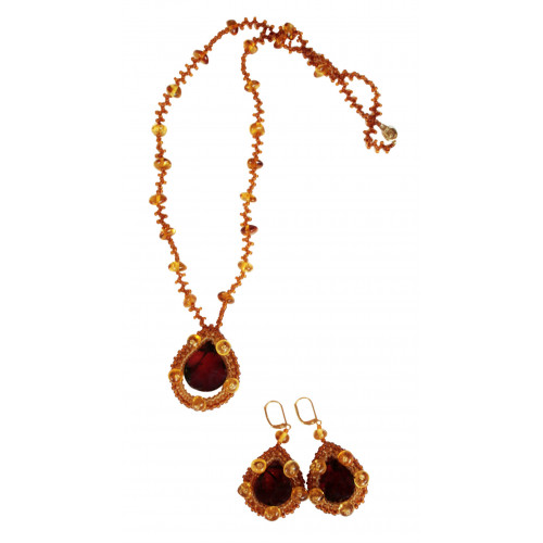 Красивый комплект из натурального янтаря и бисера: кулон, серьги 30915, 40807