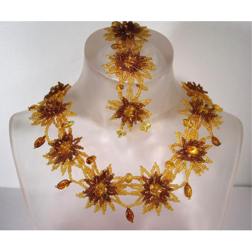 • Красивый комплект с цветами из янтаря и бисера: колье, браслет 10568b,10569n