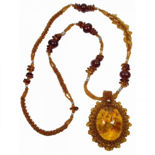 Красивый овальный кулон из натурального янтаря и бисера 30021