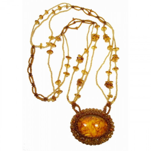 Красивый овальный кулон из натурального янтаря и бисера 30308