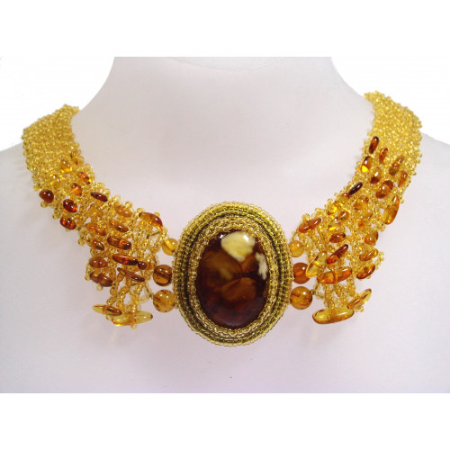 Нарядное колье из бисера и янтаря с большим янтарем в центре 10205