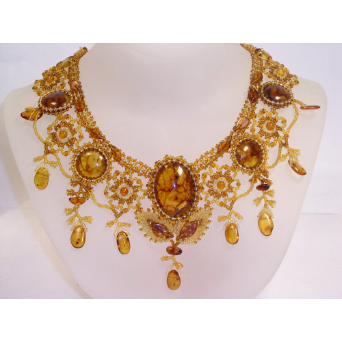 Нарядное плетеное колье из натурального янтаря и бисера 10309