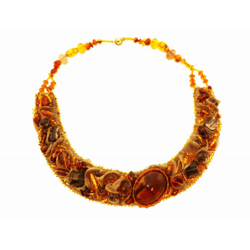 Необычное колье из янтаря бисера стеклянных бусин и натуральной кожи 10983n
