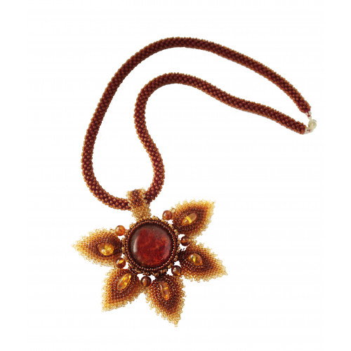 Плетеное бисерное колье с большим цветком из натурального янтаря 11031-1