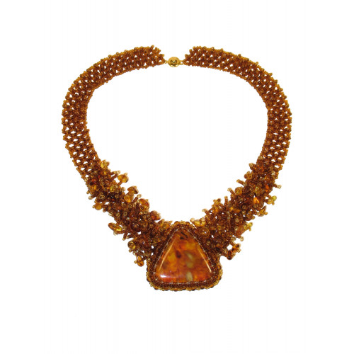 Роскошное крупное колье из бисера со вставкой цельного янтаря треугольной формы 10841