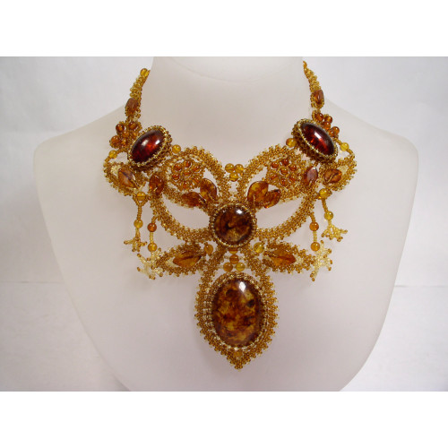 Роскошное плетеное колье из натурального янтаря и бисера 10308