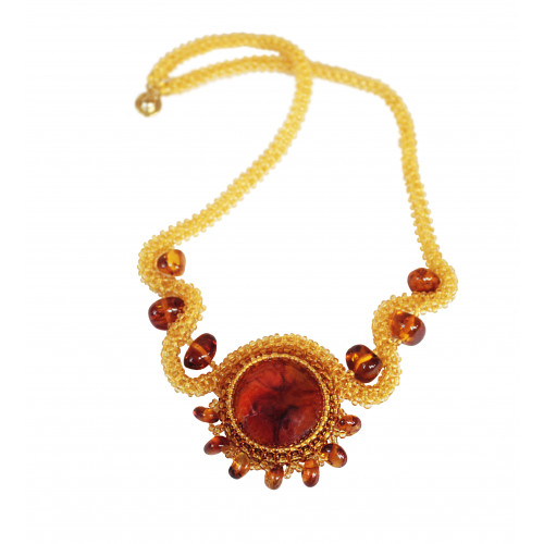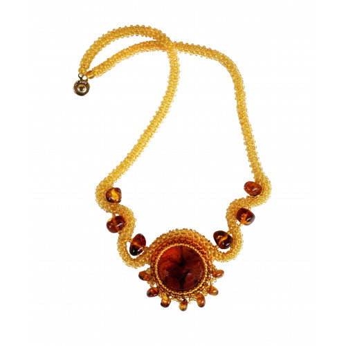 Роскошное плетеное колье из натурального янтаря с бисером 11081