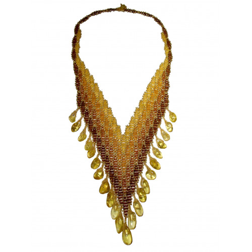 Удлиненное колье из натурального янтаря и бисера в зелено-коричнневых тонах 10577