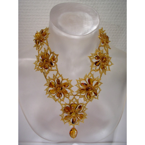 • Удлиненное плетеное колье из натурального янтаря и бисера 10692